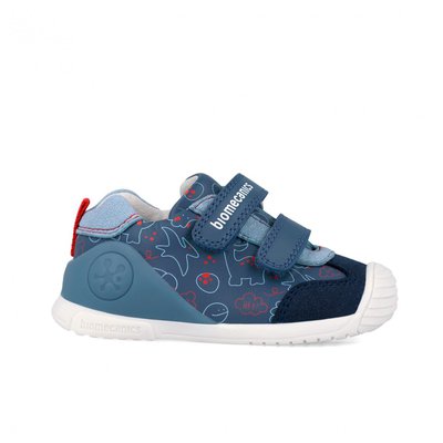 Need Biomecanics jalanõud on valmistatud nahast ja tekstiilist, sinises toonis lõbusa dinosauruse mustriga – ideaalne kaaslane laste igapäevastele seiklustele.